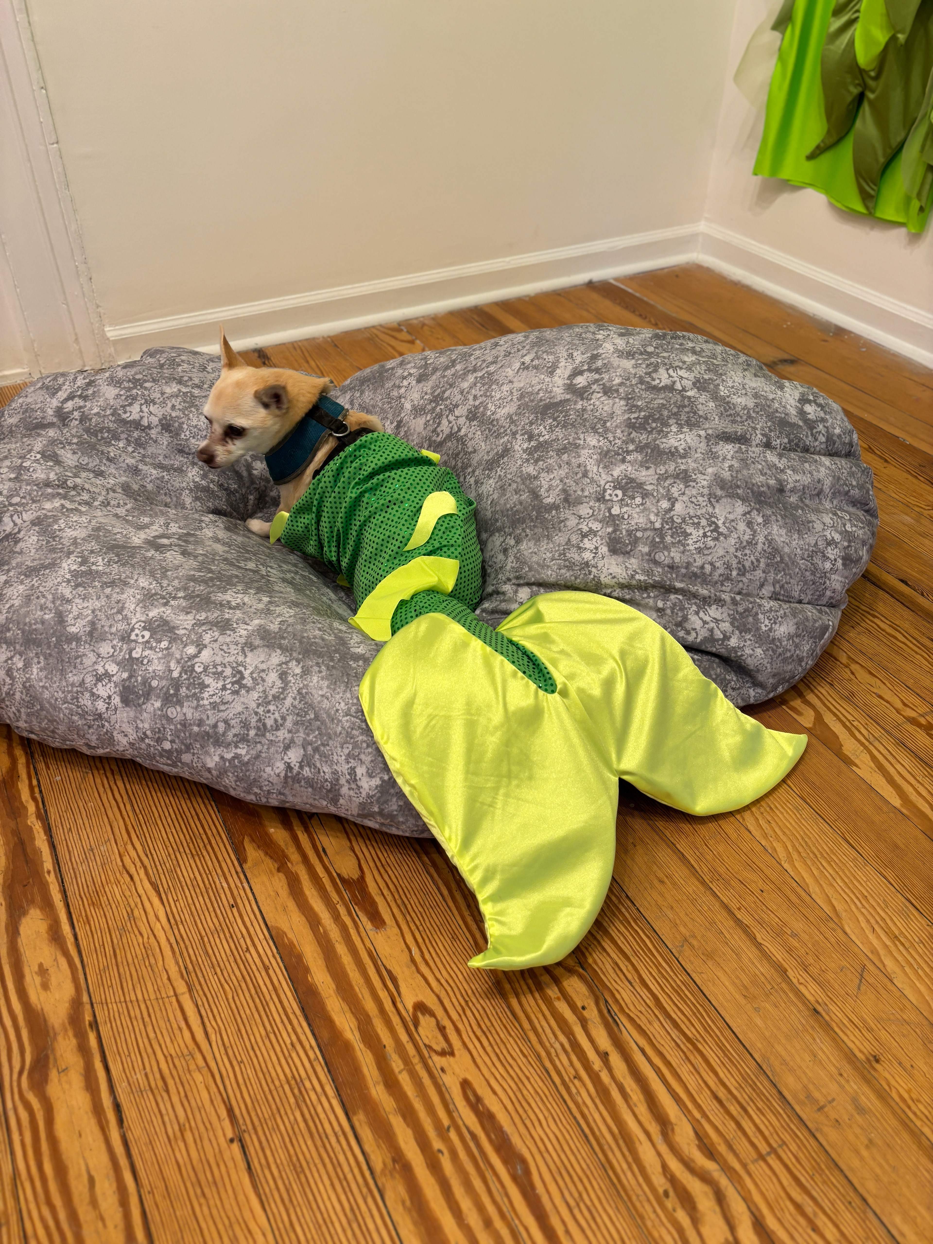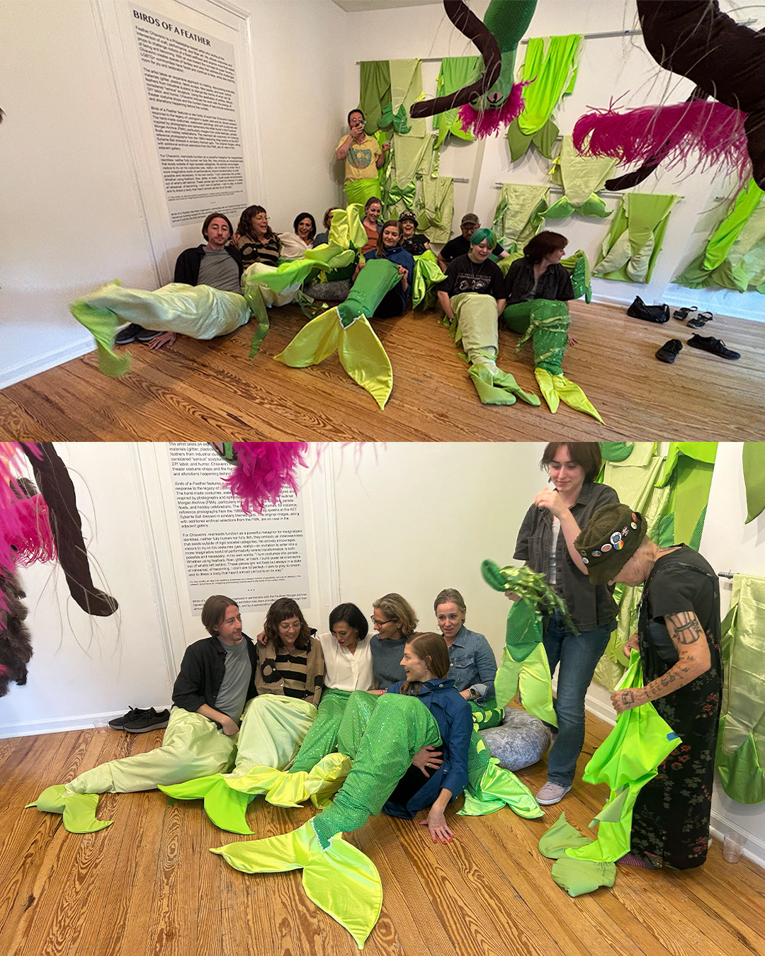 For Chiaverini, mermaids function as a powerful metaphor for marginalized identities: neither fully human nor fully fish, they embody an in-betweenness that exists outside of rigid societal categories. He actively encourages visitors to try on his costumes -- an invitation to enter into a more imaginative world of performativity where transformation is both possible and necessary. In his own words: "I turn costumes into portals ... Whether using feathers, fiber, glitter, or trash, I build queer environments out of what’s left behind. These pieces are not fixed but always in a state of rehearsal, of becoming. I don’t aim to perfect—I aim to play, to dream, and to dress a body that hasn't arrived yet but is on its way."