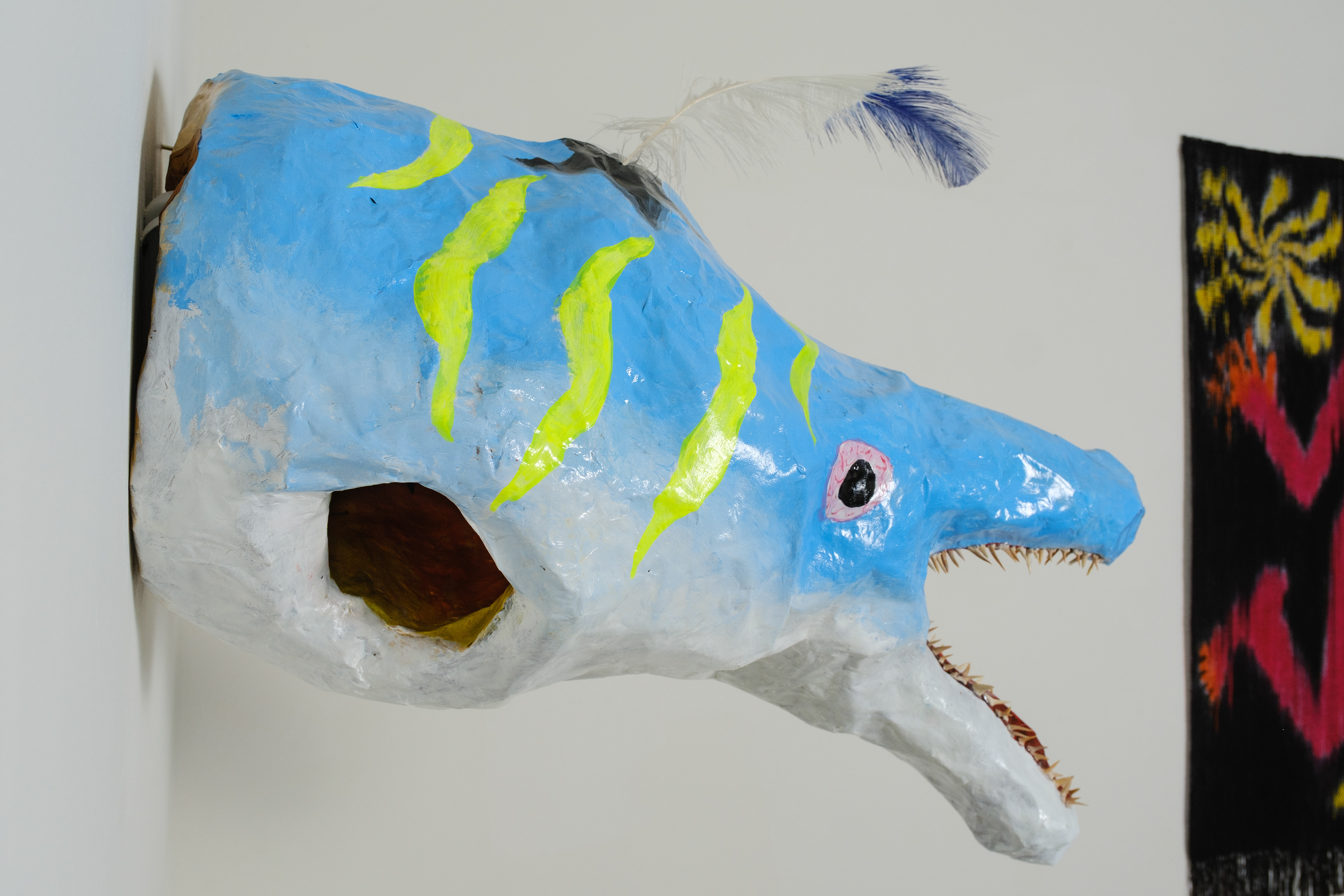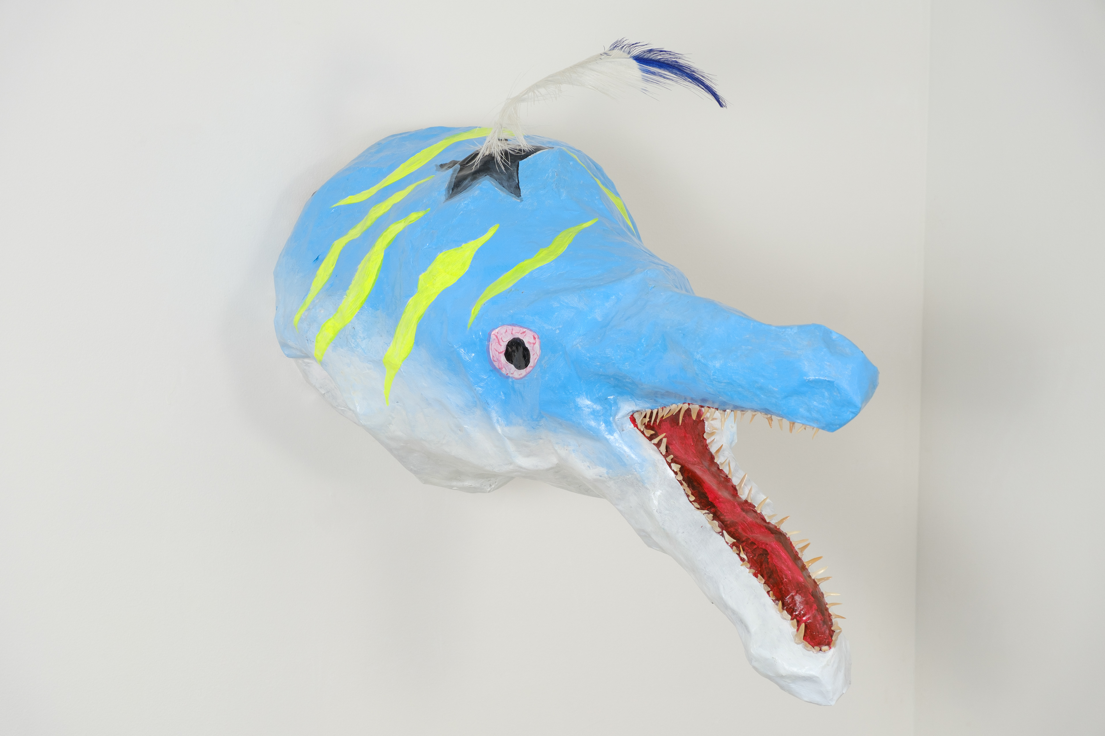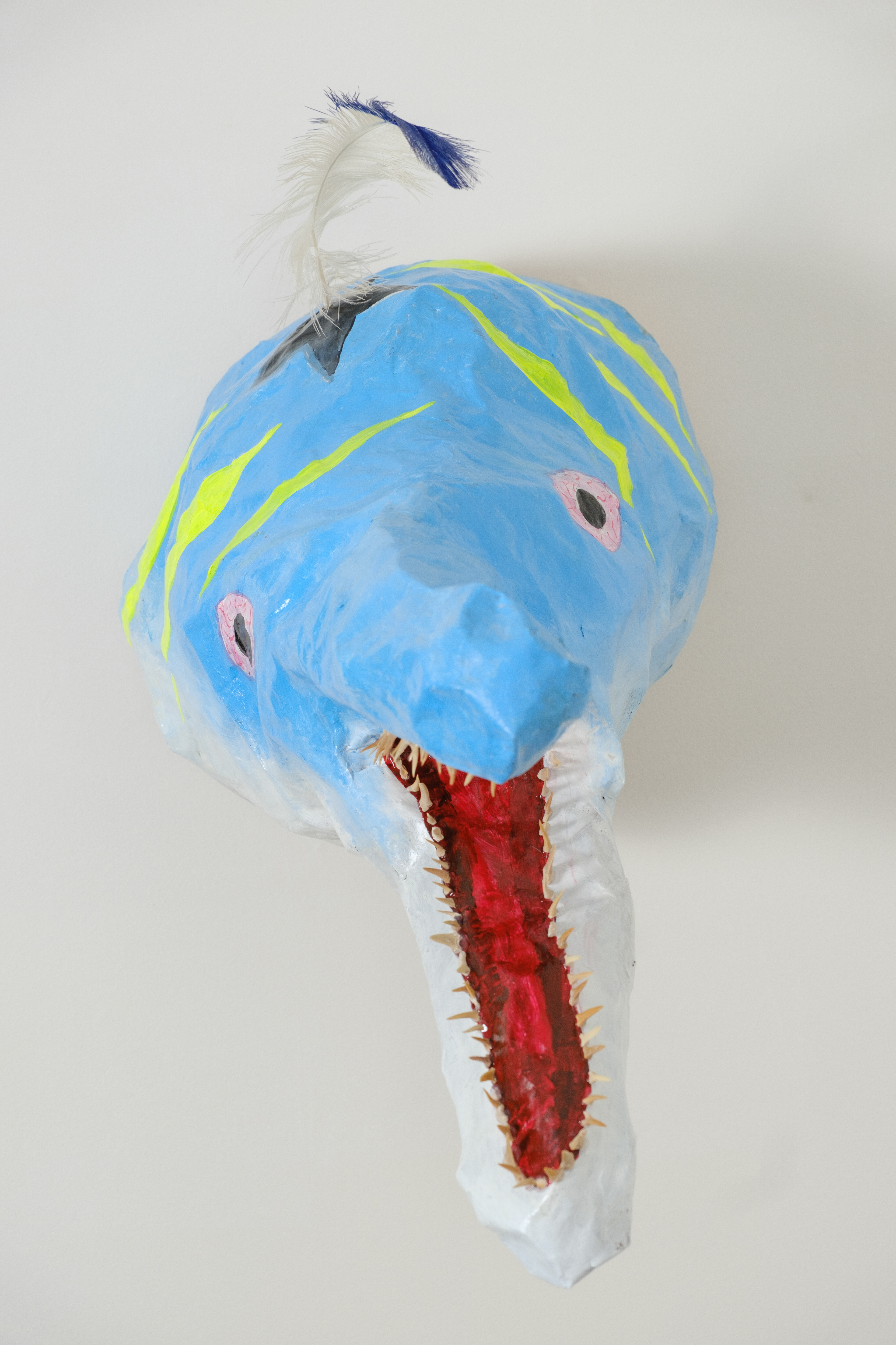 Paper mache, ostrich feather, fossilized shark teeth