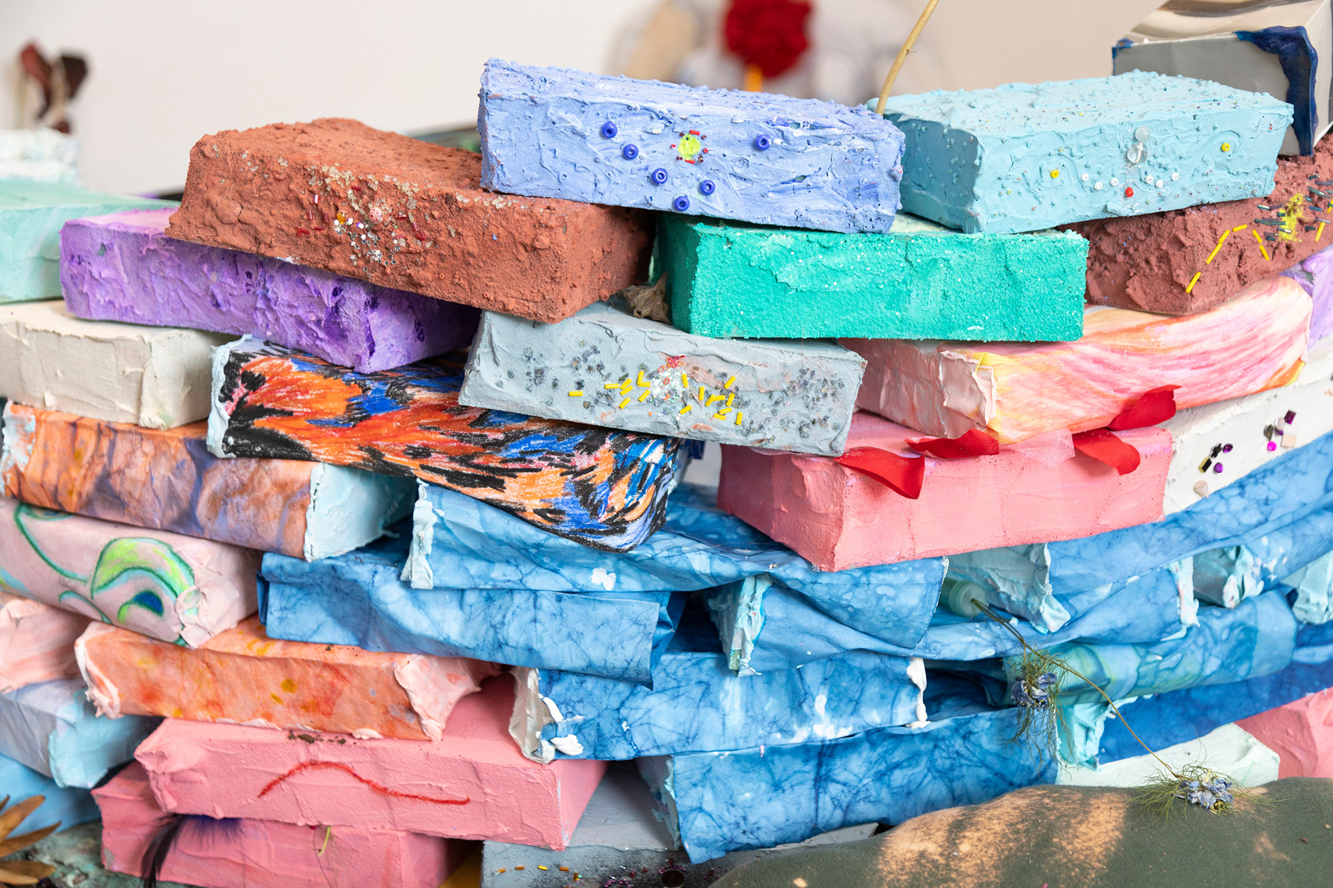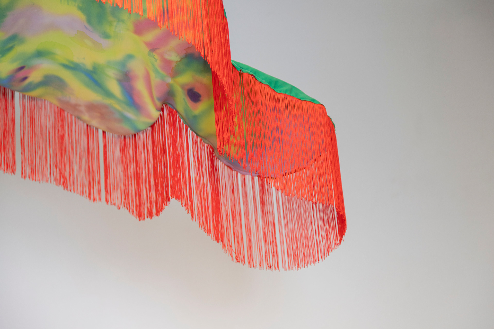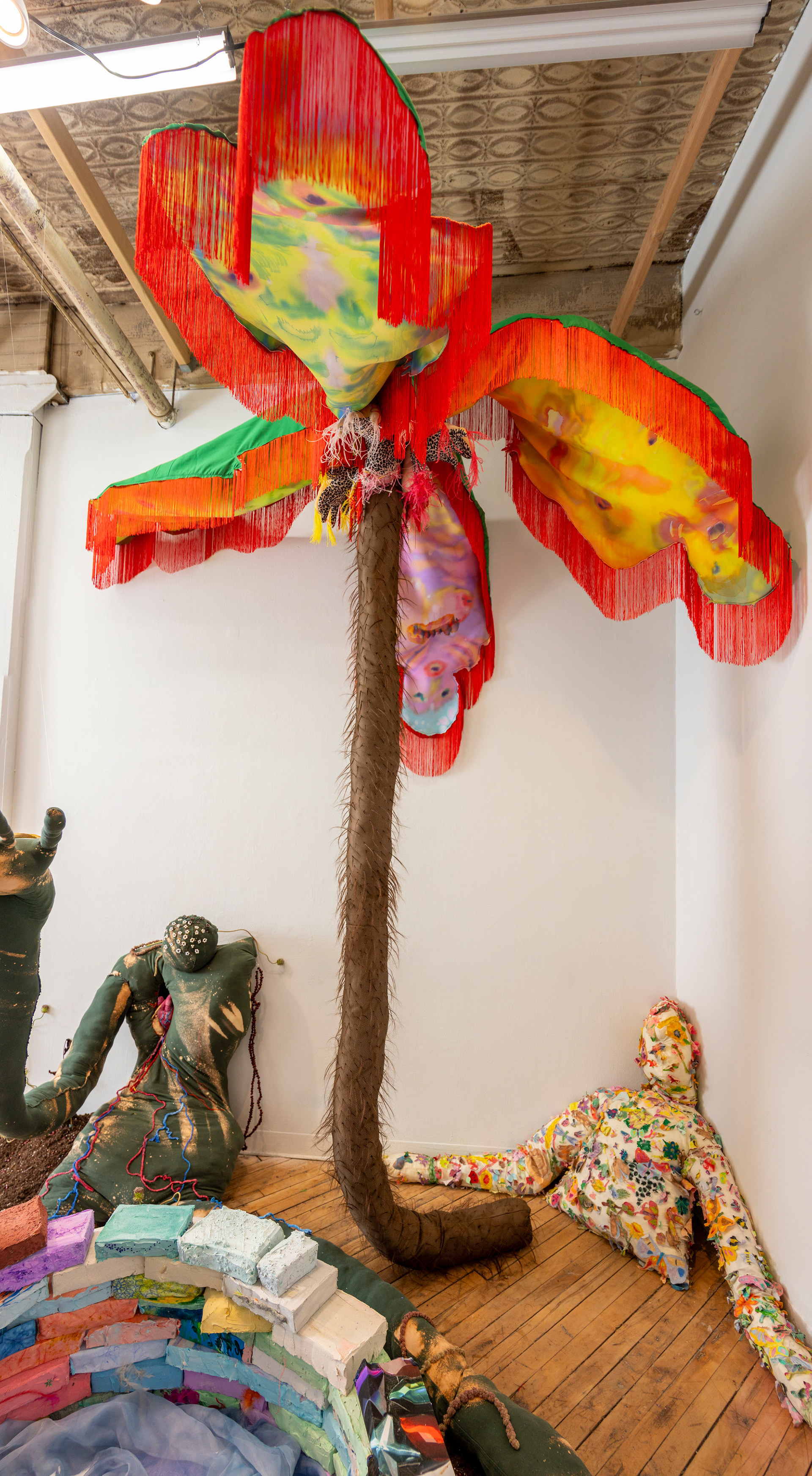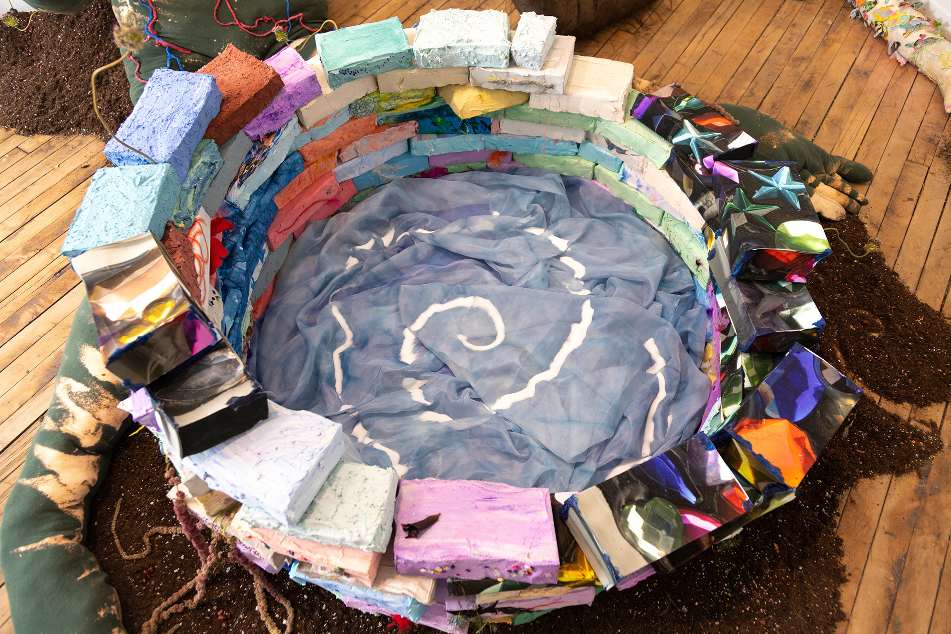 This spring, Grizzly Grizzly presents We Found a Well, a collaborative room-sized installation by Feather Chiaverini and Natasha Fortson, an homage to José Muñoz, Octavia Butler, Louise Bourgeois, and Belkis Ayón. In We Found A Well Chiaverini and Fortson intentionally evoke the sensation of club lights turning on after an all-night party while simultaneously imagining where a queer revolution may lead us–perhaps through the looking glass, to a colorful and festooned utopia.
