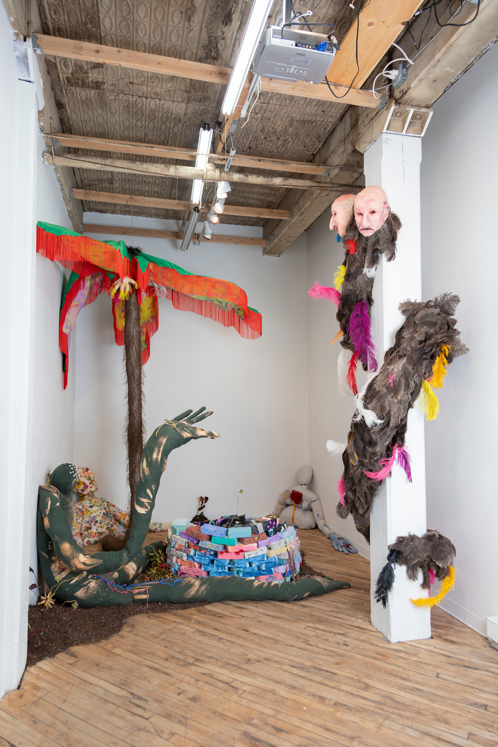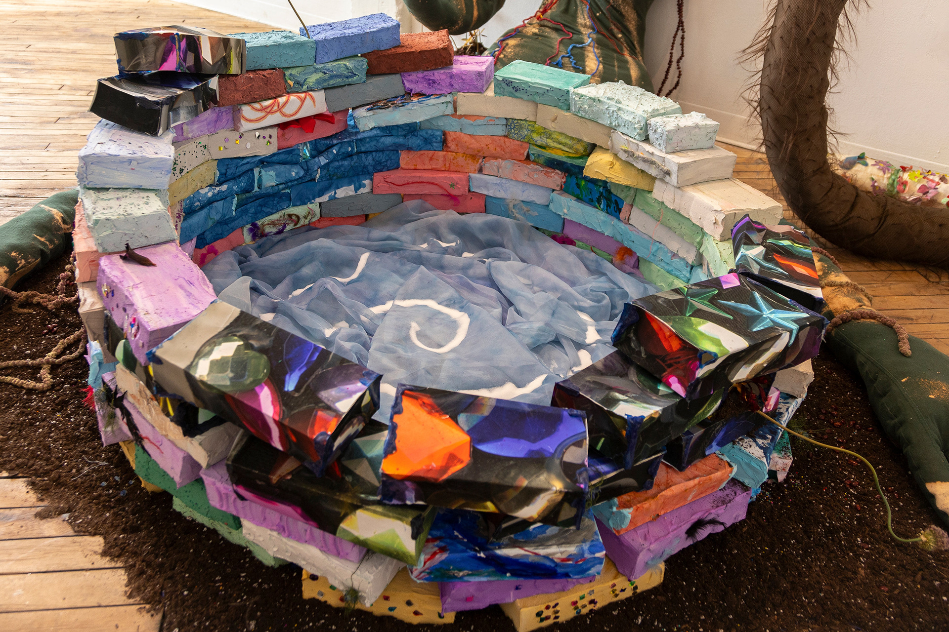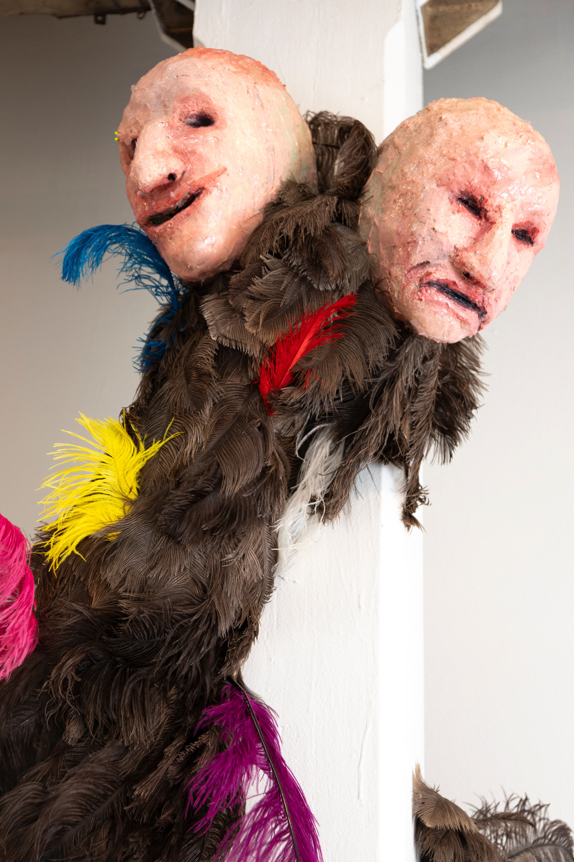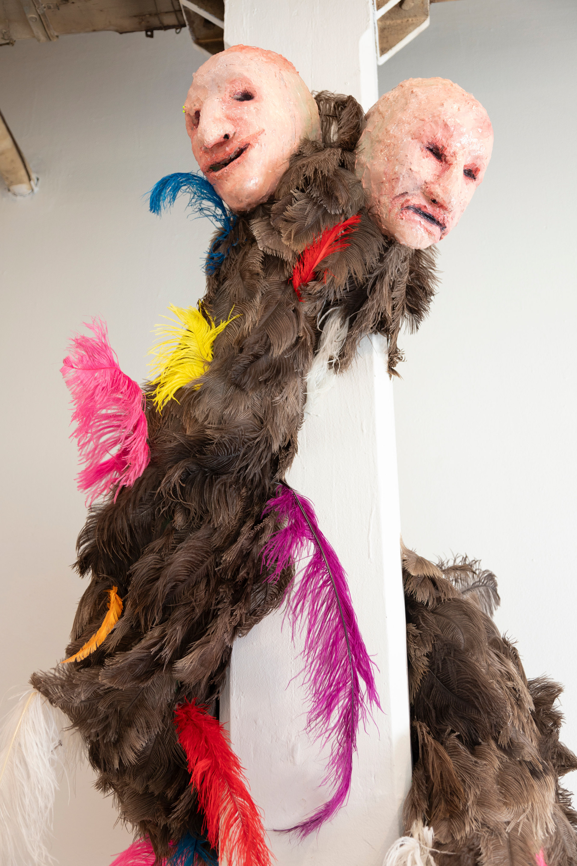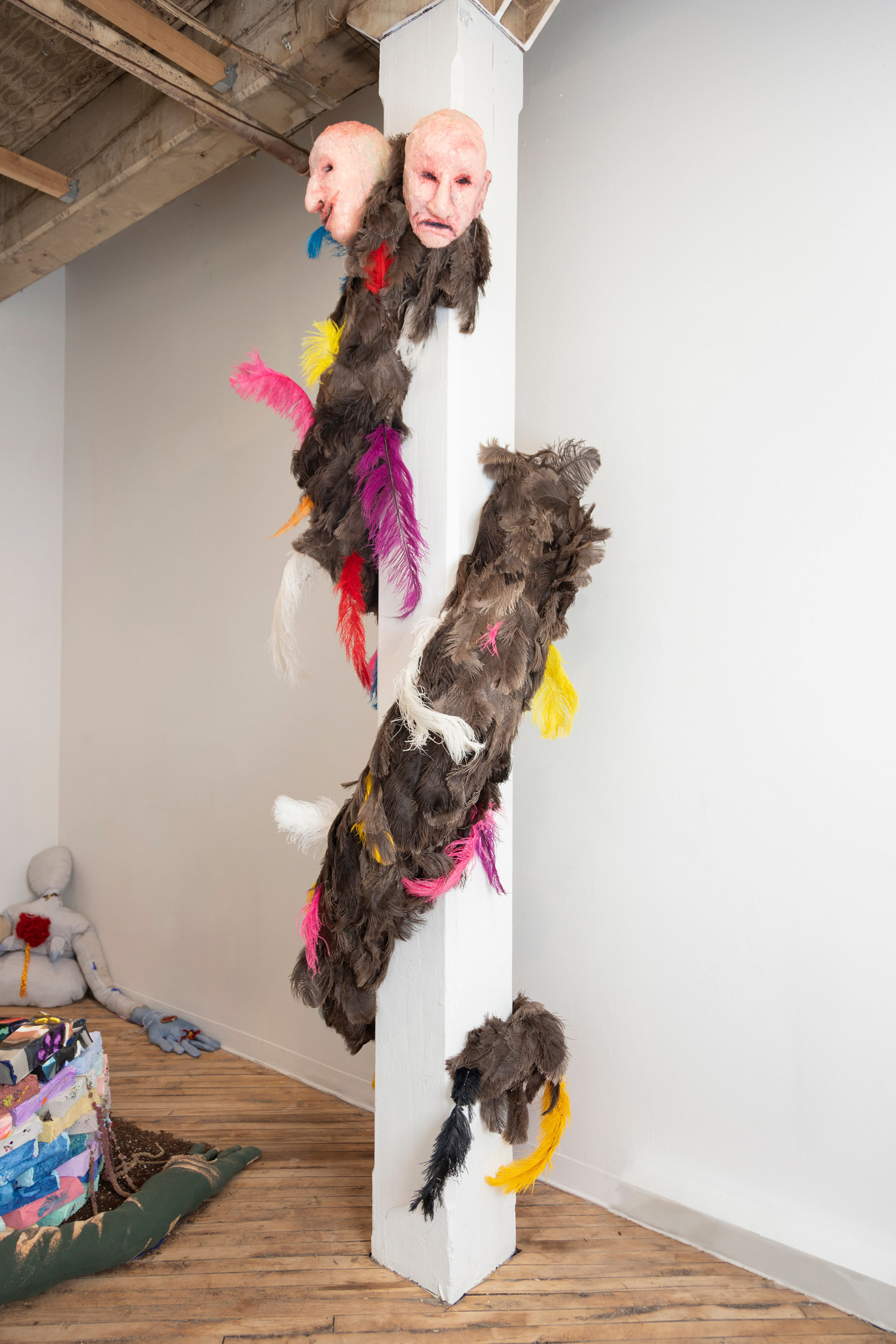 In the center of the space, Chiaverini and Fortson place a paper mâché well, a watering hole, a place to commune adorned with gems, photographs and “things found on the ground.” The well is surrounded by outstretched creatures, constructed from ostrich feathers, silicone, athletic mesh, one wig, beads, braided fabric, and neoprene. The beings are arranged so as to seem to contemplate the well as the source of life. Here, Fortson and Chiaverini envision a world where their relationship with queerness, texture, nature, joy, and horror takes deepest root, of this they state, "Dropped off where the portal left us, we found a well. We are filled with joys of discovery and complicated fears of being discovered."