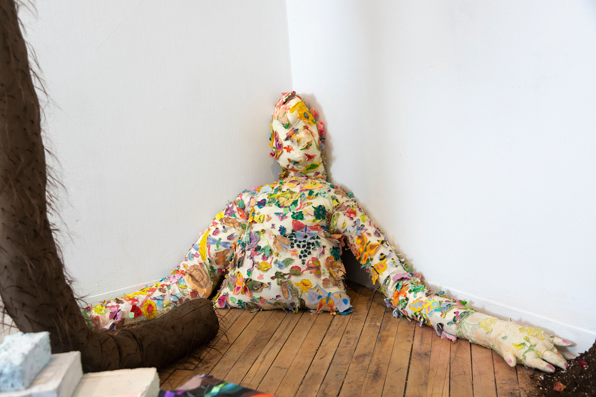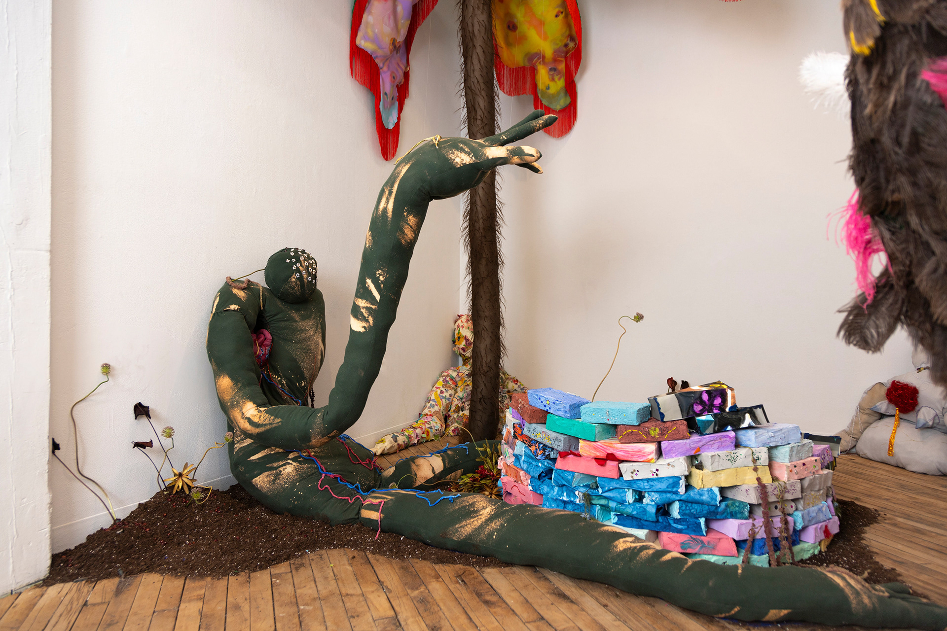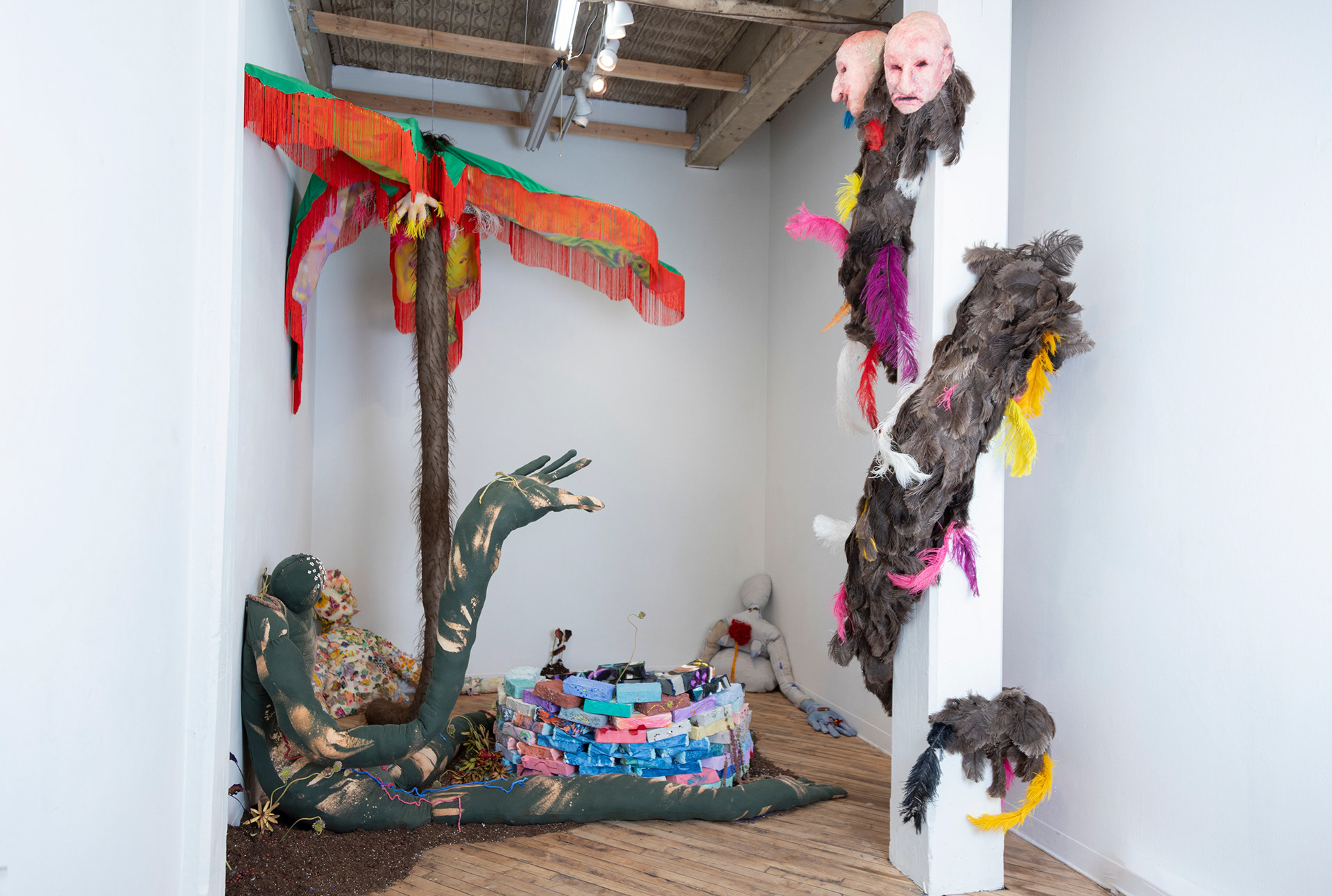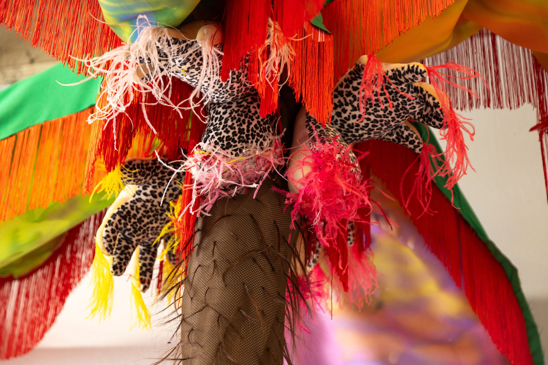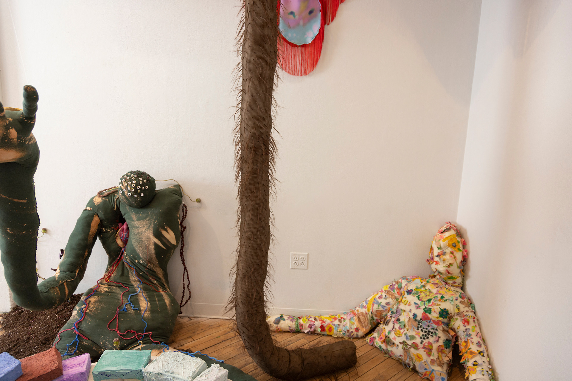 In the center of the space, Chiaverini and Fortson place a paper mâché well, a watering hole, a place to commune adorned with gems, photographs and “things found on the ground.” The well is surrounded by outstretched creatures, constructed from ostrich feathers, silicone, athletic mesh, one wig, beads, braided fabric, and neoprene. The beings are arranged so as to seem to contemplate the well as the source of life. Here, Fortson and Chiaverini envision a world where their relationship with queerness, texture, nature, joy, and horror takes deepest root, of this they state, "Dropped off where the portal left us, we found a well. We are filled with joys of discovery and complicated fears of being discovered."
