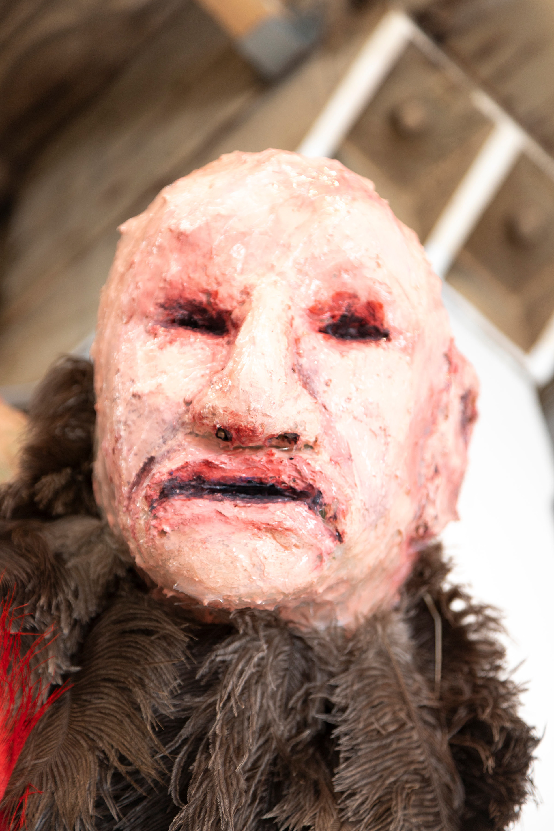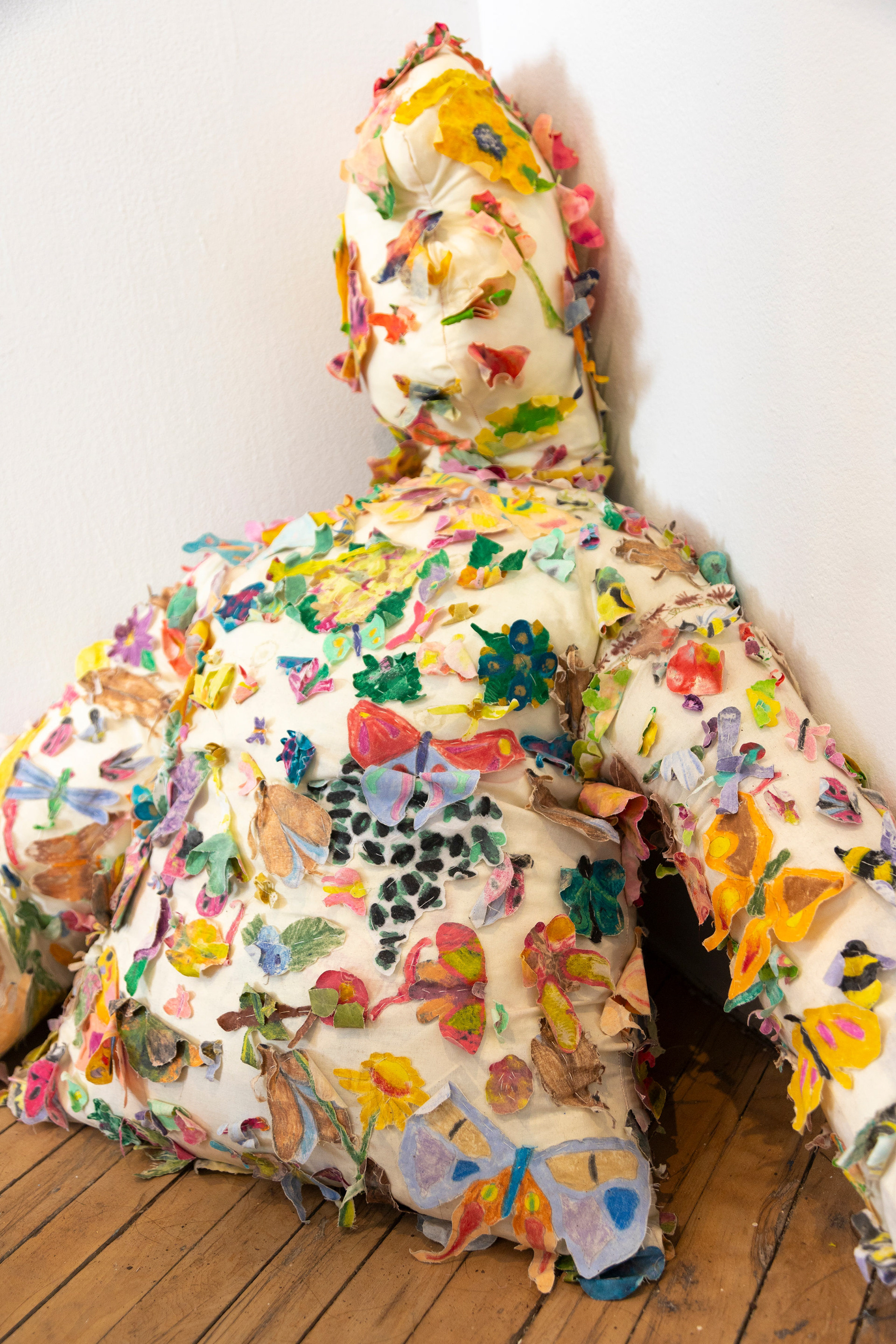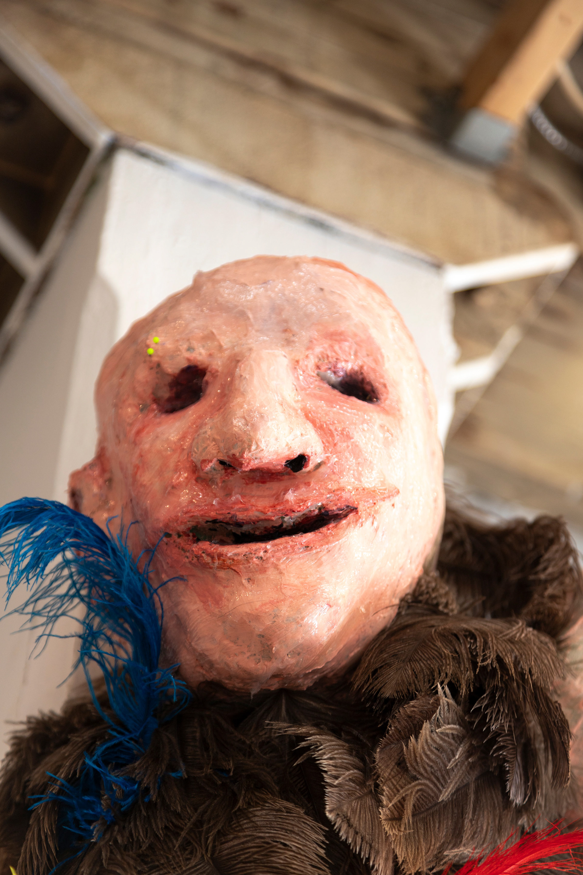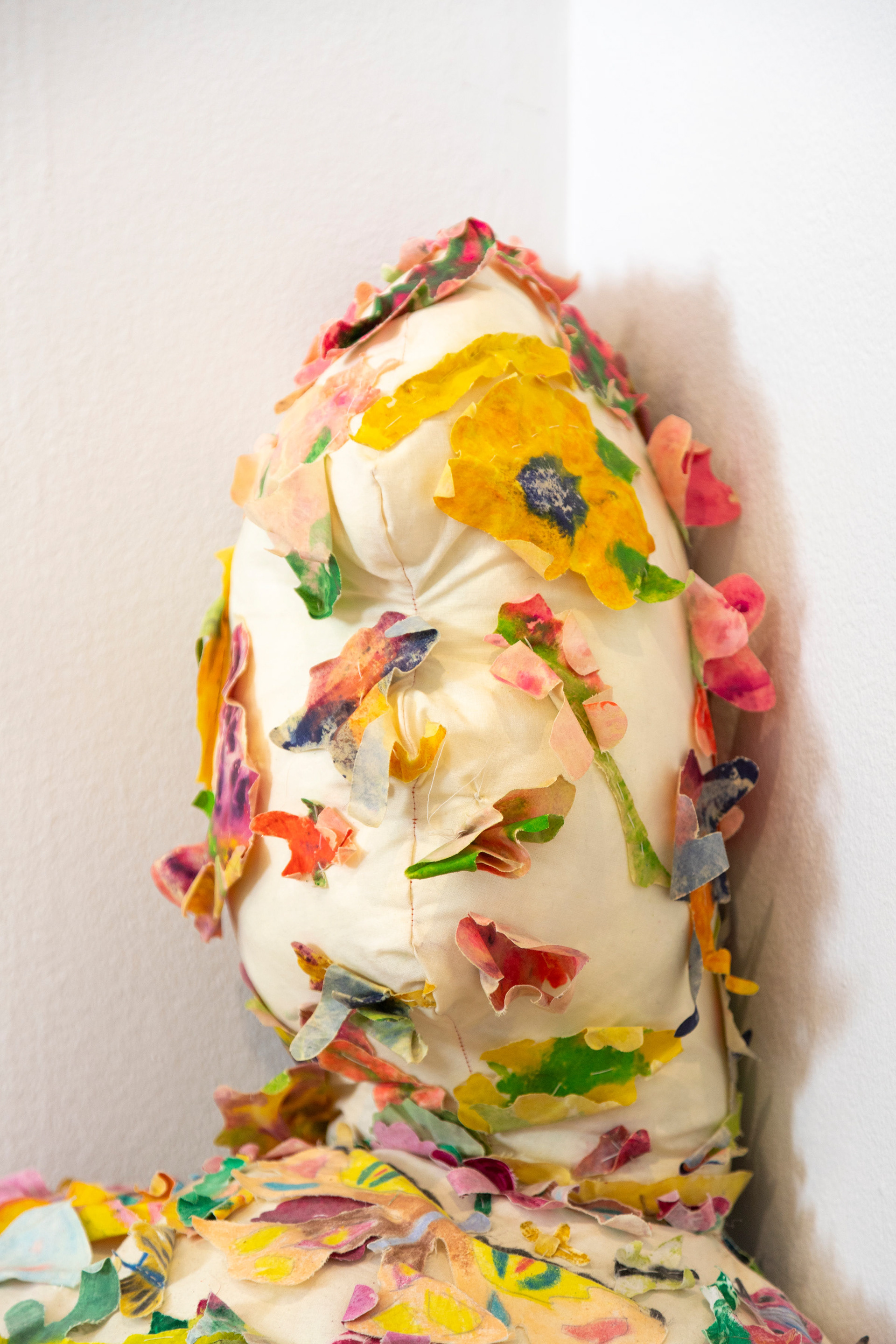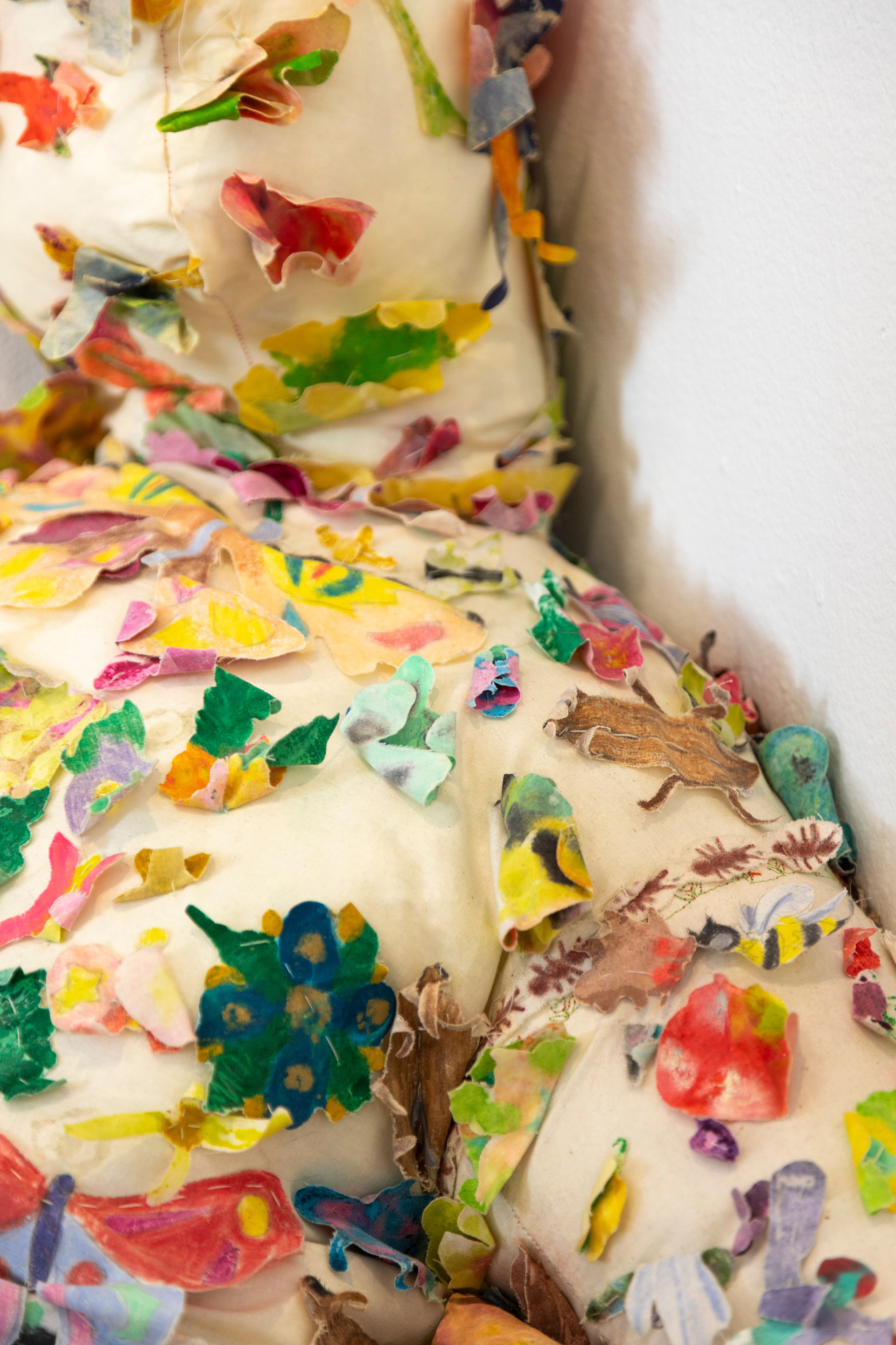 In the center of the space, Chiaverini and Fortson place a paper mâché well, a watering hole, a place to commune adorned with gems, photographs and “things found on the ground.” The well is surrounded by outstretched creatures, constructed from ostrich feathers, silicone, athletic mesh, one wig, beads, braided fabric, and neoprene. The beings are arranged so as to seem to contemplate the well as the source of life. Here, Fortson and Chiaverini envision a world where their relationship with queerness, texture, nature, joy, and horror takes deepest root, of this they state, "Dropped off where the portal left us, we found a well. We are filled with joys of discovery and complicated fears of being discovered."
